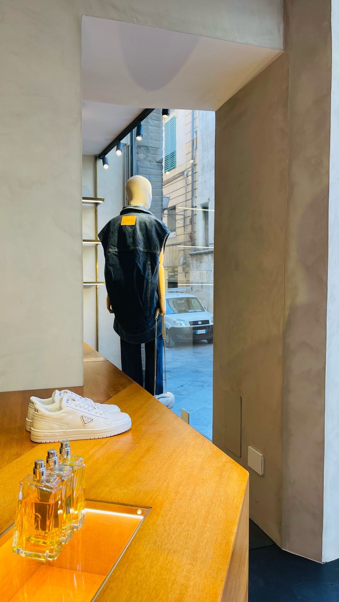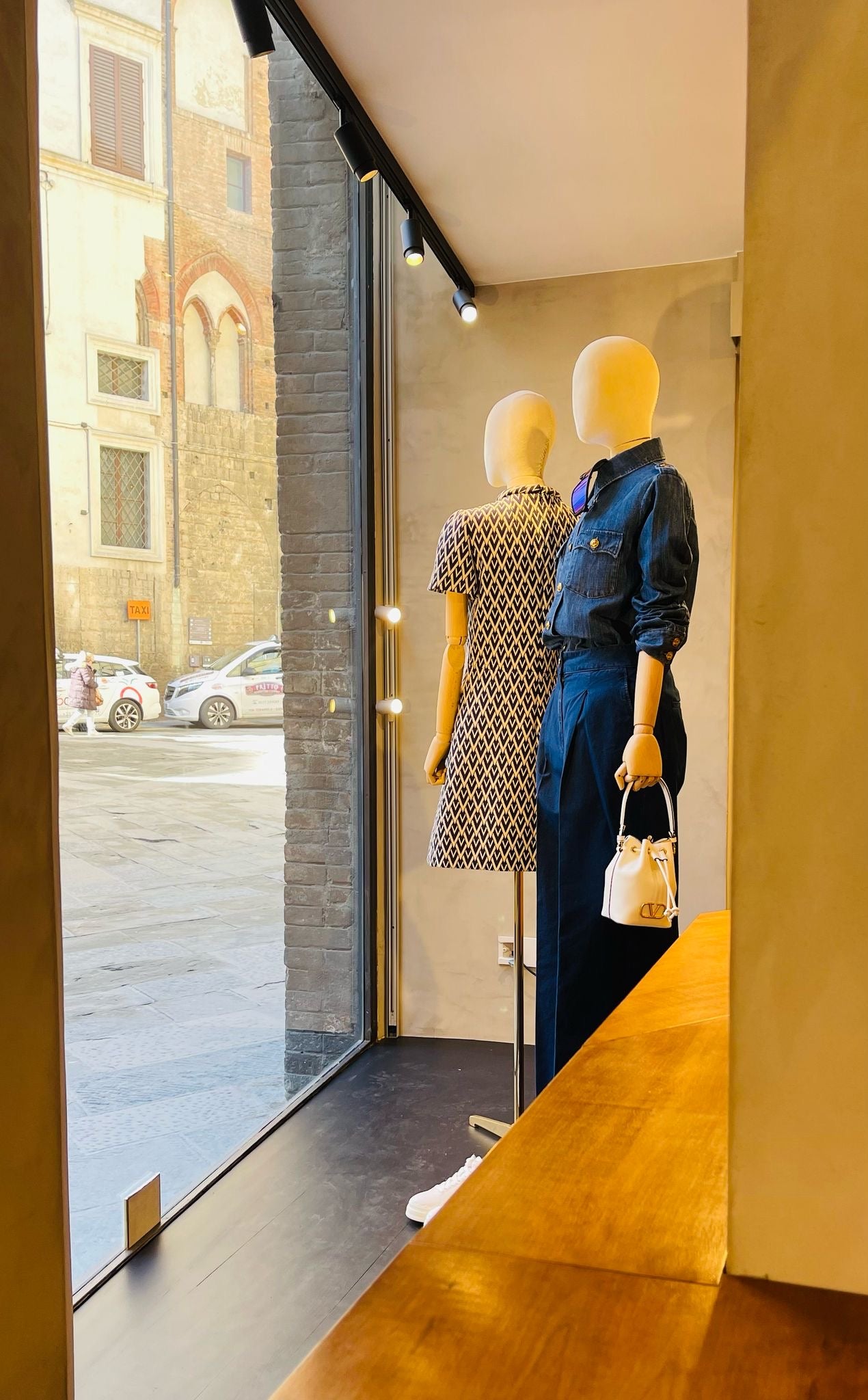 II contesto dalle forti connotazioni storiche si rispecchia negli interni del negozio, restaurato completamente dallo Studio Baciocchi: le maestose vetrate che sembrano essere il riflesso delle Logge del Papa creano un continuum tra esterno e interno, i materiali utilizzati − ferro, pietra, legno − riecheggiano la tradizione rinascimentale toscana, sette teche in stile museale si susseguono lungo il corridoio di ingresso e accompagnano il cliente in uno spazio multifunzionale con affaccio diretto su un cortile interno di Palazzo Piccolomini.