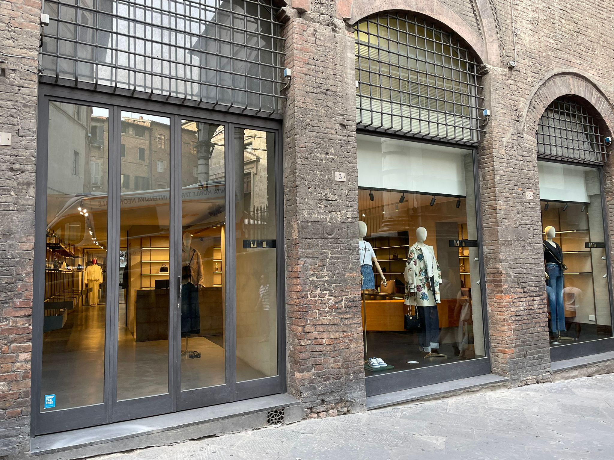 The context with strong historical connotations is reflected in the interior of the shop, completely restored by Studio Baciocchi: the majestic windows that seem to be the reflection of the “Logge del Papa” create a continuum between exterior and interior, the materials used − iron, stone, wood − echo the Tuscan Renaissance tradition, seven museum-style display cases follow one another along the entrance corridor and accompany the customer into a multifunctional space directly overlooking an internal courtyard of Palazzo Piccolomini.